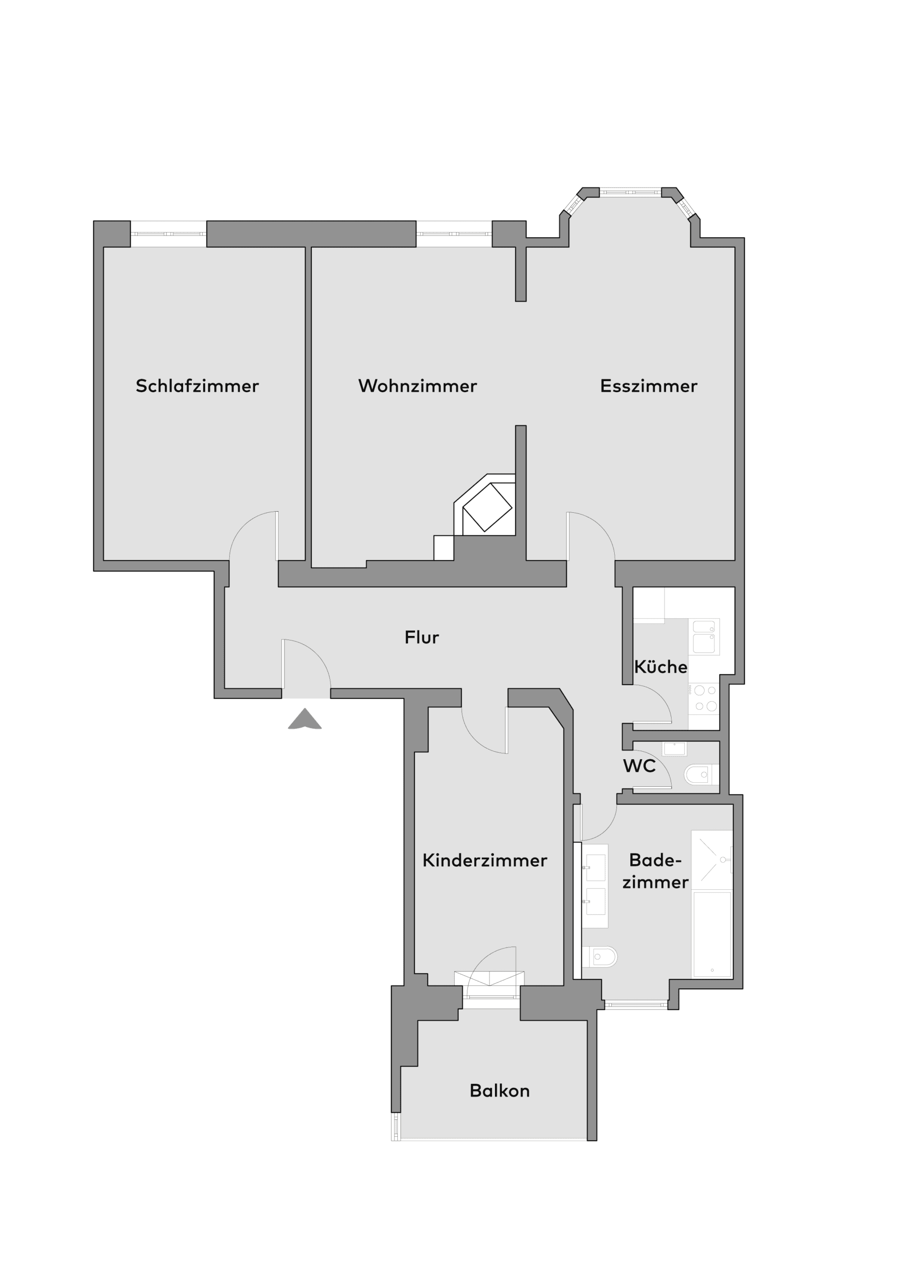 Highlight ist das Wohn-/Essensemble, verbunden durch einen Rundbogen, erweitert um einen Erker und akzentuiert durch einen Kamin (derzeit stillgelegt; Reaktivierung wird geprüft). Die Abfolge wirkt großzügig und elegant, lässt sich bei Bedarf aber wieder klar in Wohn- und Essbereich trennen.