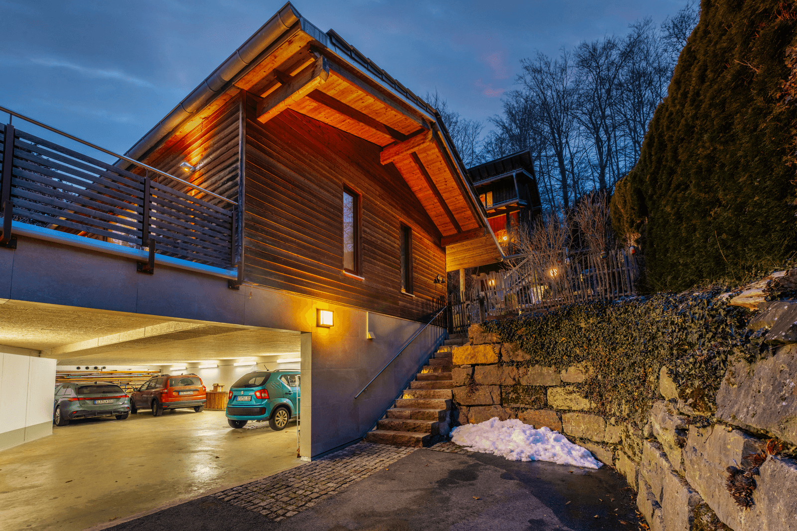 Die massive Hanggarage des Ensembles bietet nicht nur Platz für bis zu fünf Fahrzeuge, sondern ist technisch bereits für den Einbau eines Personenlifts zur Westterrasse vorbereitet.