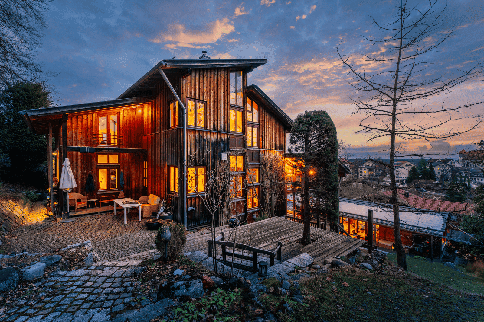 Ein architektonisches Juwel ist die große, markante Dreiecksterrasse im Südosten, die durch ihre Lage am Hang völlig uneinsehbar ist und einen privaten Logenplatz unter freiem Himmel bietet. Eine zweite Terrasse öffnet sich zum gemeinsamen Garten und fördert so die Synergie des Ensembles, wann immer Gemeinschaft gewünscht ist.