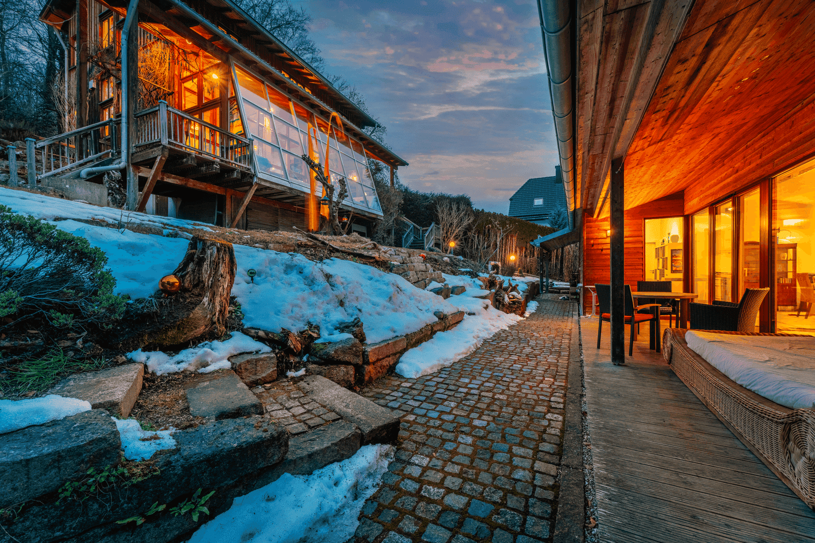 Nostalgisch und funktional zugleich zeigt sich das Haus in seiner Verbindung zur Außenwelt durch vier separate Zugänge: Vom Lastenlift Zugang in der Speisekammer über die Terrassentür der Küche bis hin zum Veranda-Austritt aus dem Wintergarten und der phänomenalen Aussichtsterrasse am Eingang – hier wird die Natur zum integralen Bestandteil des Wohnens.