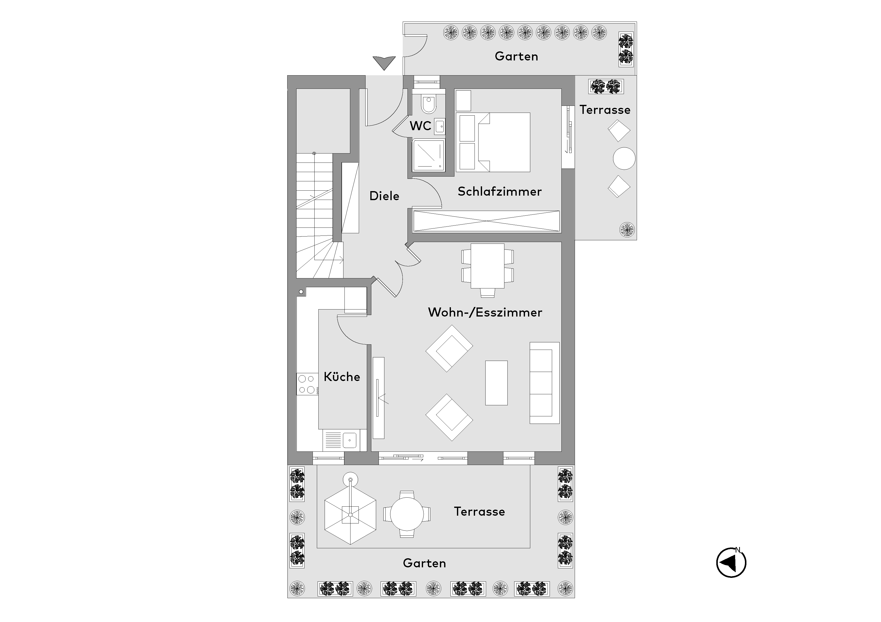 Zwei separate Terrassen mit insgesamt ca. 50 m² Gartenfläche bieten viel Platz für entspannte Stunden im Freien. Der lichtdurchflutete Wohn- und Essbereich mit direktem Zugang zur Hauptterrasse und dem Garten bildet das Herzstück der Wohnung. Die moderne, separate Küche, ein elegantes Hauptbadezimmer mit Badewanne und Dusche sowie ein zusätzliches Gäste-WC mit Dusche bieten höchsten Wohnkomfort.