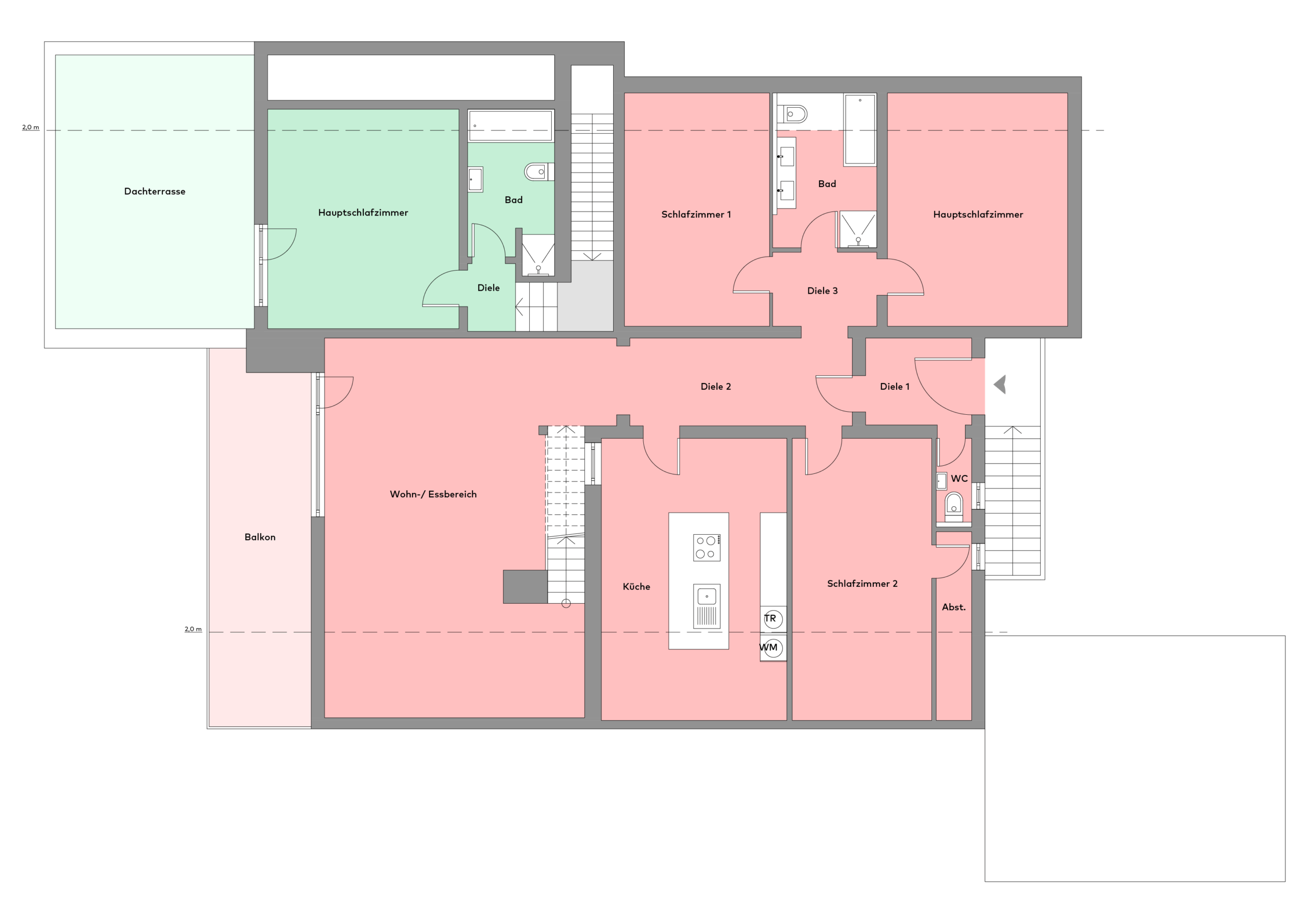Weitere Annehmlichkeiten wie elektrische Rollläden, integrierte Insektenschutznetze und – in der Dachgeschosswohnung – eine moderne Klimaanlage sorgen für ein rundum komfortables Wohngefühl. Einzugsfertig gestaltet, bieten diese Wohnungen viel Raum für individuelle Lebensentwürfe und generationsübergreifendes Wohnen auf höchstem Niveau.