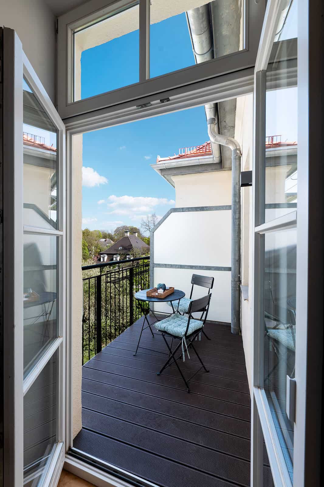 Die rund 106 m² verteilen sich auf drei Zimmer mit Raumhöhen von bis zu 3,26 Metern, eine Großzügigkeit, die man heute kaum noch findet. Das original erhaltene Eichen-Fischgrätparkett, die weißen Kassettentüren mit ihren goldenen Messingbeschlägen und die feinen Stuckdetails erzählen die Geschichte des Hauses. Die 2024 vollzogene Modernisierung antwortet darauf mit klarer Formensprache und höchster Materialqualität – ohne die Seele des Gebäudes zu berühren.