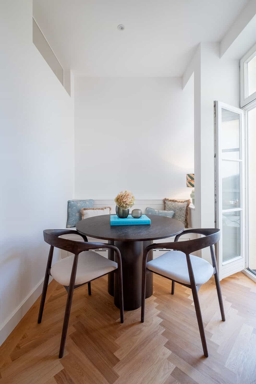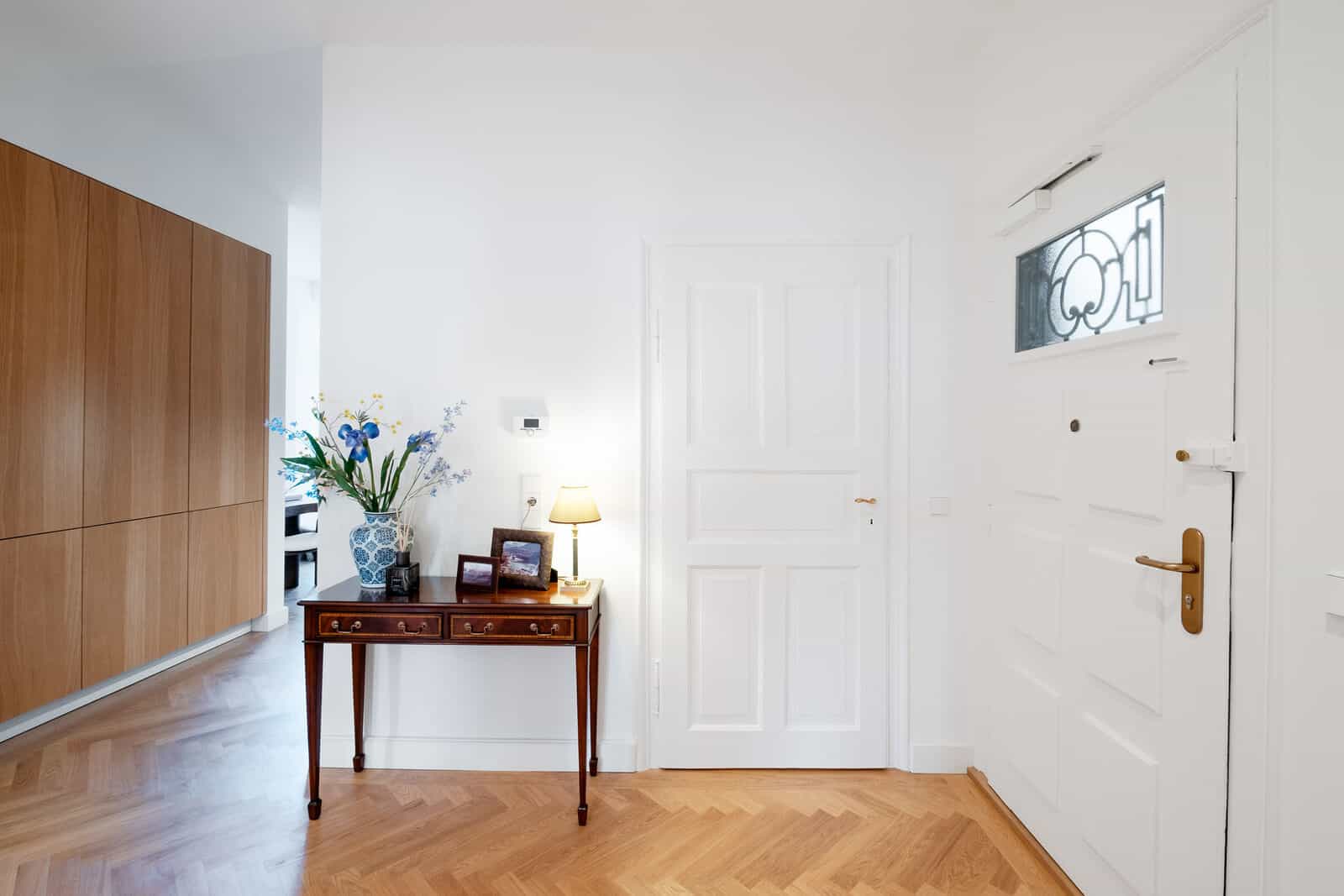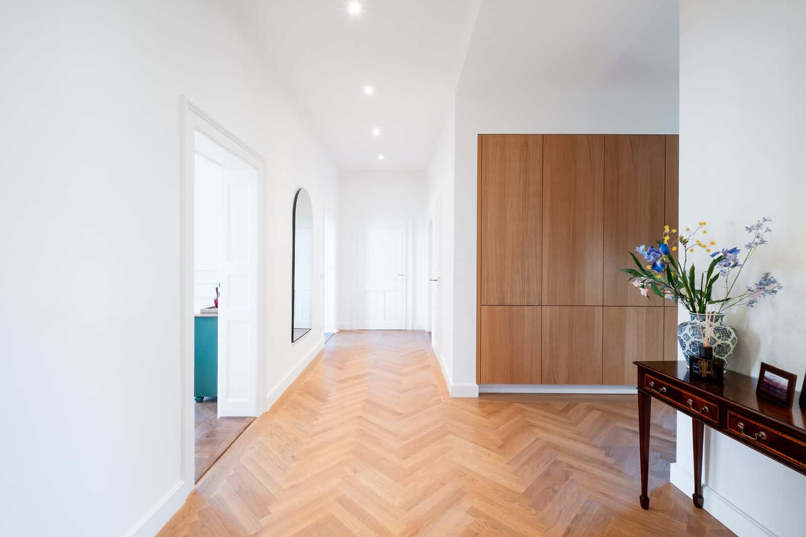 Im Inneren bestimmen wenige, aber starke Elemente das Bild. Das Eichen-Fischgrätparkett – teils original, teils aufwändig aufgearbeitet – zieht sich durch alle Wohnräume und verleiht jedem Schritt Charakter. Weiße Fußleisten, Stuckprofile an den Decken und Kassettentüren mit historischen Messingbeschlägen bilden den zeitlosen Rahmen. Die Schiebetür zwischen Wohn- und Esszimmer ist dabei nicht nur funktional, sondern selbst ein gestalterisches Statement.