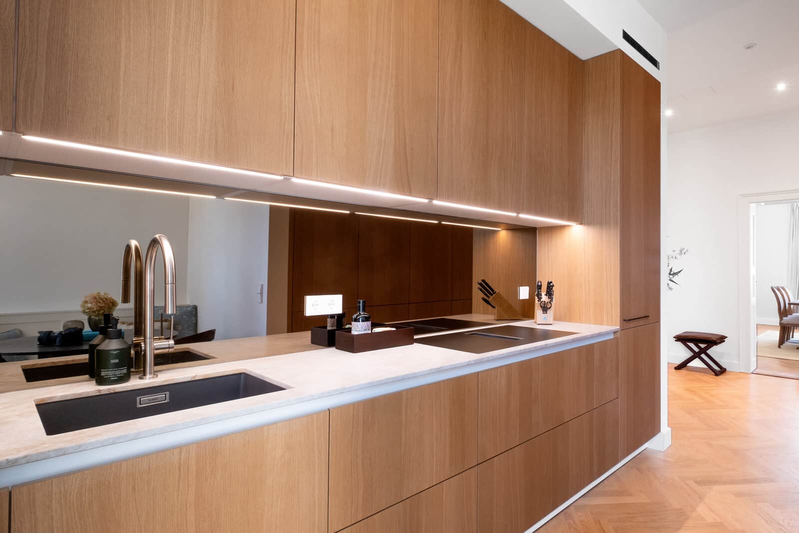 In der Küche trifft Handwerk auf Technologie: maßgefertigte Einbauten mit grifflosen Holzfronten, eine Arbeitsfläche aus hellem Naturstein und eine vollständige Miele-Ausstattung inklusive Induktionskochfeld mit integriertem Abzug, Backofen, Kühl-Gefrier-Kombination, Weinkühler, Geschirrspüler und Waschmaschine. Hinter Falttüren verbirgt sich eine eigene Kaffee-Station, die Alltagsmomente aufwertet.