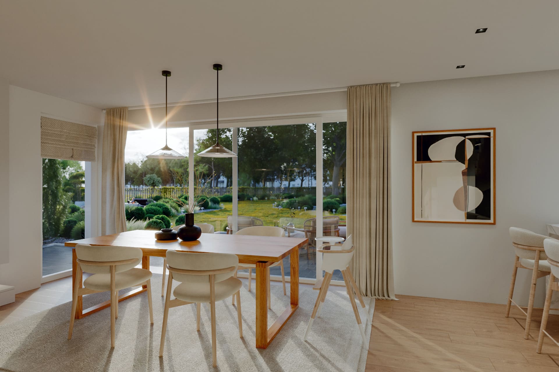Die hohen Decken in Verbindung mit den großen Fenstern sorgen für viel natürliches Licht und geben gleichzeitig den Blick auf die umliegende Natur frei. An allen Fenstern (außer an den Kellerfenstern) befinden sich elektrisch betriebene Rollläden, welche zur Verschattung an heißen Sommertagen dienen und vor allem in den Schlafbereichen für einen gesteigerten Komfort sorgen.